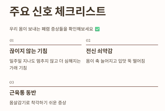 - 단순히 목이 아픈 감기와 달리, 폐 깊숙한 곳에서부터 통증이 느껴진다면 의심해 봐야 해요. 🩺