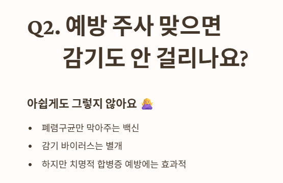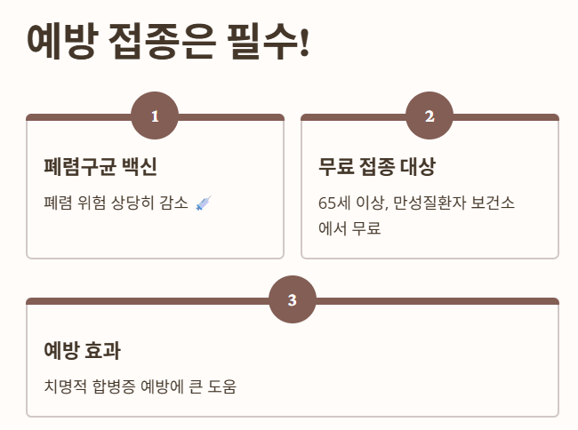 - 폐렴 예방 접종은 '폐렴구균'이라는 특정 세균을 막아주는 것이지, 수많은 감기 바이러스까지 막아주는 것은 아니에요. 하지만 치명적인 합병증을 막는 데는 큰 도움이 됩니다.