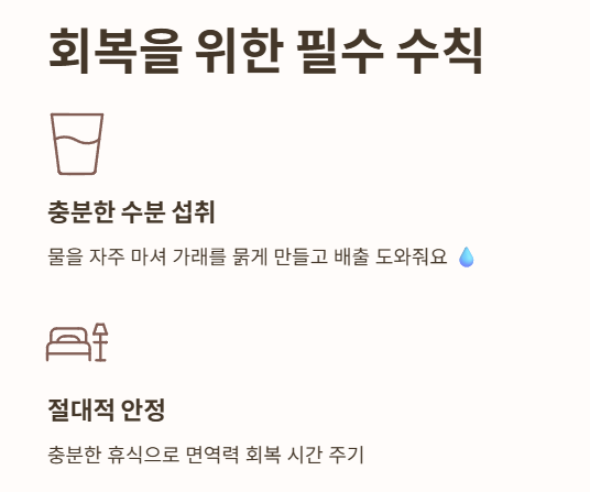 - 무엇보다 절대적인 안정을 취하며 면역력이 회복될 시간을 주어야 합니다.