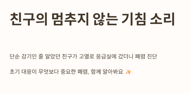 얼마 전 친한 친구가 단순한 감기인 줄 알고 약만 먹다가, 고열이 떨어지지 않아 응급실에 갔더니 폐렴 진단을 받았어요. 😥
