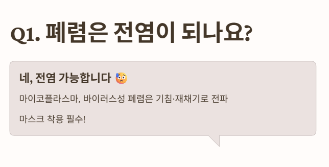 - 모든 폐렴이 전염되는 것은 아니지만, 마이코플라스마나 바이러스성 폐렴은 기침이나 재채기를 통해 타인에게 옮길 수 있으니 마스크 착용이 필수입니다.