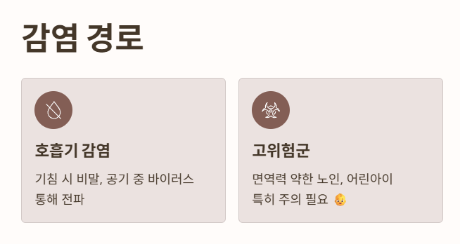 - 주로 호흡기를 통해 감염되는데, 기침할 때 나오는 비말이나 공기 중의 바이러스를 통해 옮길 수 있어요.