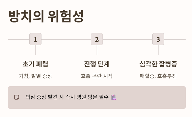 - 제때 치료하지 않으면 패혈증이나 호흡부전 같은 심각한 합병증으로 이어질 수 있어요.