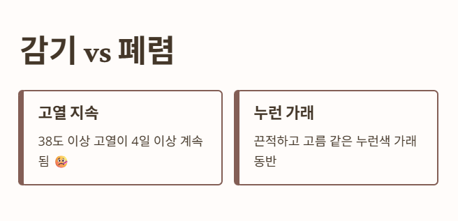 - 2주 이상 기침이 지속되고 누런 가래나 흉통이 동반된다면 단순 감기가 아닐 수 있으니, 반드시 흉부 X-레이 촬영을 통해 폐렴 증상인지 확인해보세요.