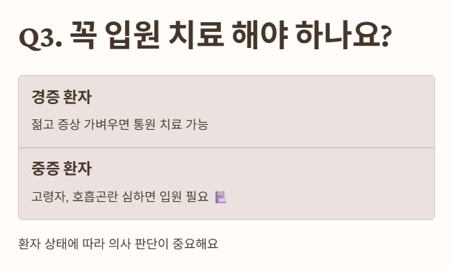 - 증상이 가볍고 젊은 환자는 통원 치료로도 충분히 호전될 수 있어요. 하지만 고령자나 호흡 곤란이 심한 경우에는 입원 치료가 필요할 수 있습니다.