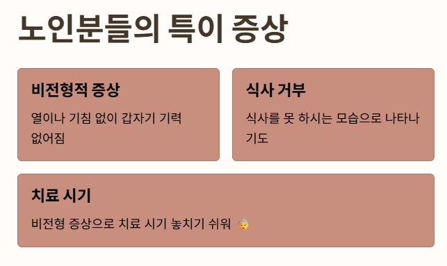 - 특히 어르신들은 열이나 기침 없이, 갑자기 기력이 없거나 식사를 못 하시는 모습으로 나타나기도 해요.