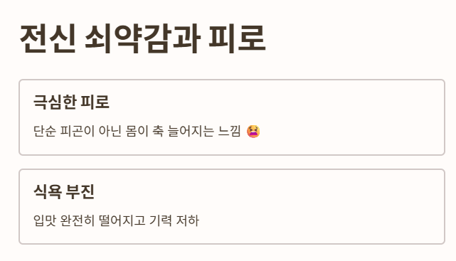 - 단순히 피곤한 정도가 아니라, 몸이 축 늘어지고 입맛이 뚝 떨어지는 현상이 나타나요. 😫