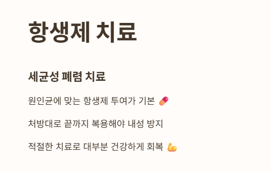 - 의사 선생님의 처방에 따라 약을 끝까지 복용해야 내성이 생기지 않고 완벽하게 폐렴 증상을 잡을 수 있어요. 💊