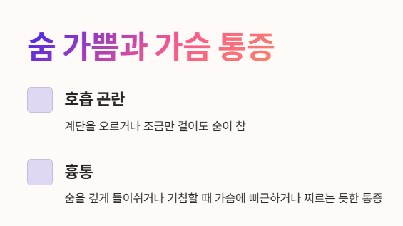 - 숨을 깊게 들이쉬거나 기침할 때 가슴에 뻐근하거나 찌르는 듯한 통증(흉통)이 느껴지기도 해요. 😫