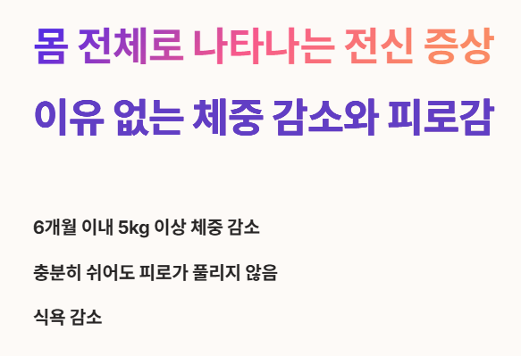 - 특별히 다이어트를 하지 않았는데 6개월 이내에 5kg 이상 체중이 줄었다면 주의해야 해요.