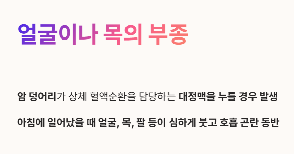 - 아침에 일어났을 때 얼굴, 목, 팔 등이 심하게 붓고 호흡 곤란이 동반될 수 있습니다.
