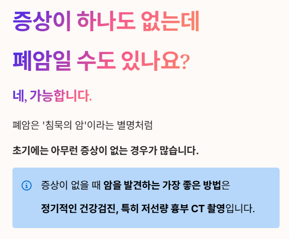 - 폐암은 '침묵의 암'이라는 별명처럼 초기에는 아무런 증상이 없는 경우가 많습니다.