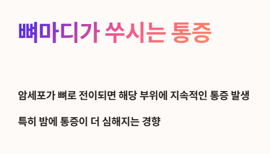 - 암세포가 뼈로 전이되면 해당 부위에 지속적인 통증이 발생할 수 있어요.