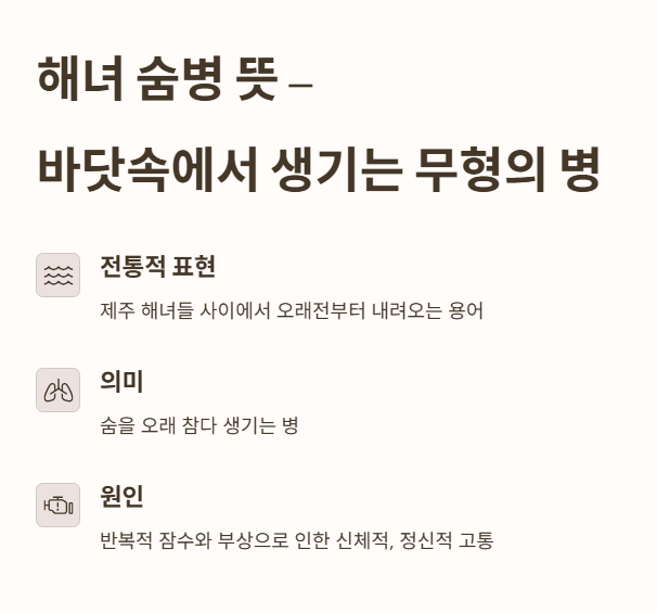 ‘숨병’은 제주 해녀들 사이에서 오래전부터 내려오는 전통적 표현인데요. 정확한 의학 용어라기보다는, 해녀들이 스스로 붙인 병명이에요. 그 뜻을 좀 더 자세히 들여다보면 다음과 같습니다.