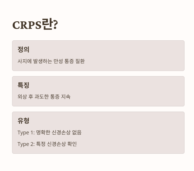 CRPS는 복합부위통증증후군으로 작은 부상에도 극심한 통증이 이어질 수 있는 질환입니다. CRPS 뜻부터 초기증상, 원인, 치료법까지 자세히 알려드립니다.