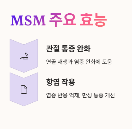 - MSM은 염증 반응을 억제해주어, 만성 통증 개선에 도움을 줍니다.