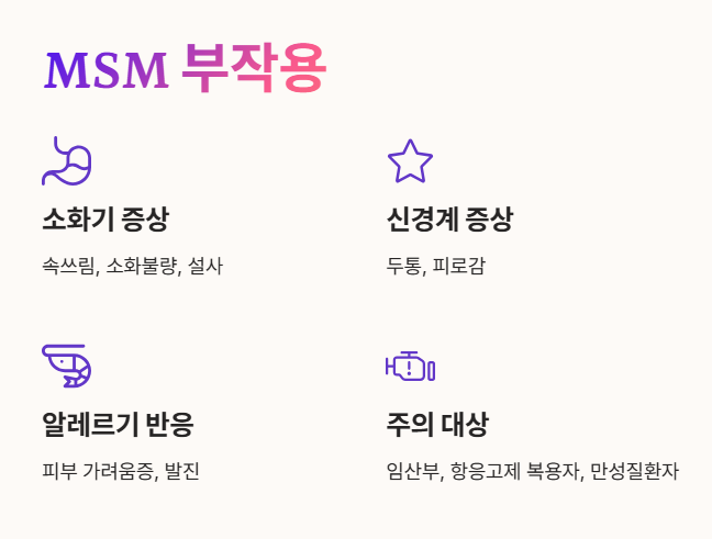 대부분의 사람에게 안전하다고 알려진 MSM이지만, 드물게 부작용을 겪는 경우도 있답니다. 아래 내용 참고해보세요!