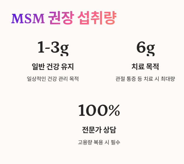 MSM은 아직 공식적인 일일 권장량(RDA)이 정해진 건 아니지만, 대부분의 연구와 전문가들이 말하는 안전한 섭취량은 다음과 같아요.