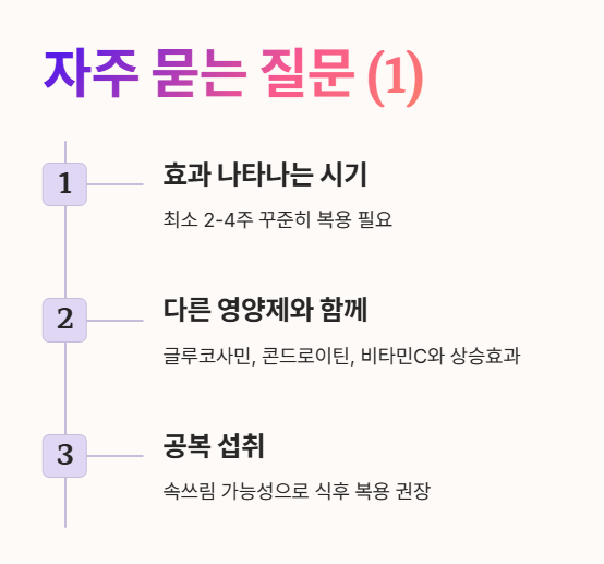 A. 최소 2~4주 이상 꾸준히 복용해야 효과를 느낄 수 있고, 3개월 이상 장기 복용 시 관절 통증 완화에 더 효과적이라는 연구도 있어요.