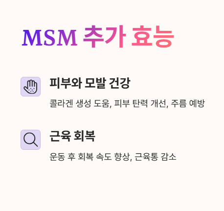 - MSM은 콜라겐 생성을 도와서 피부 탄력 개선, 주름 예방에 도움이 될 수 있어요.